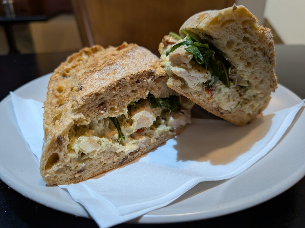 In the end I went for the chicken pesto baguette, though it was in more of a crusty elongated roll type of bread – granary style.